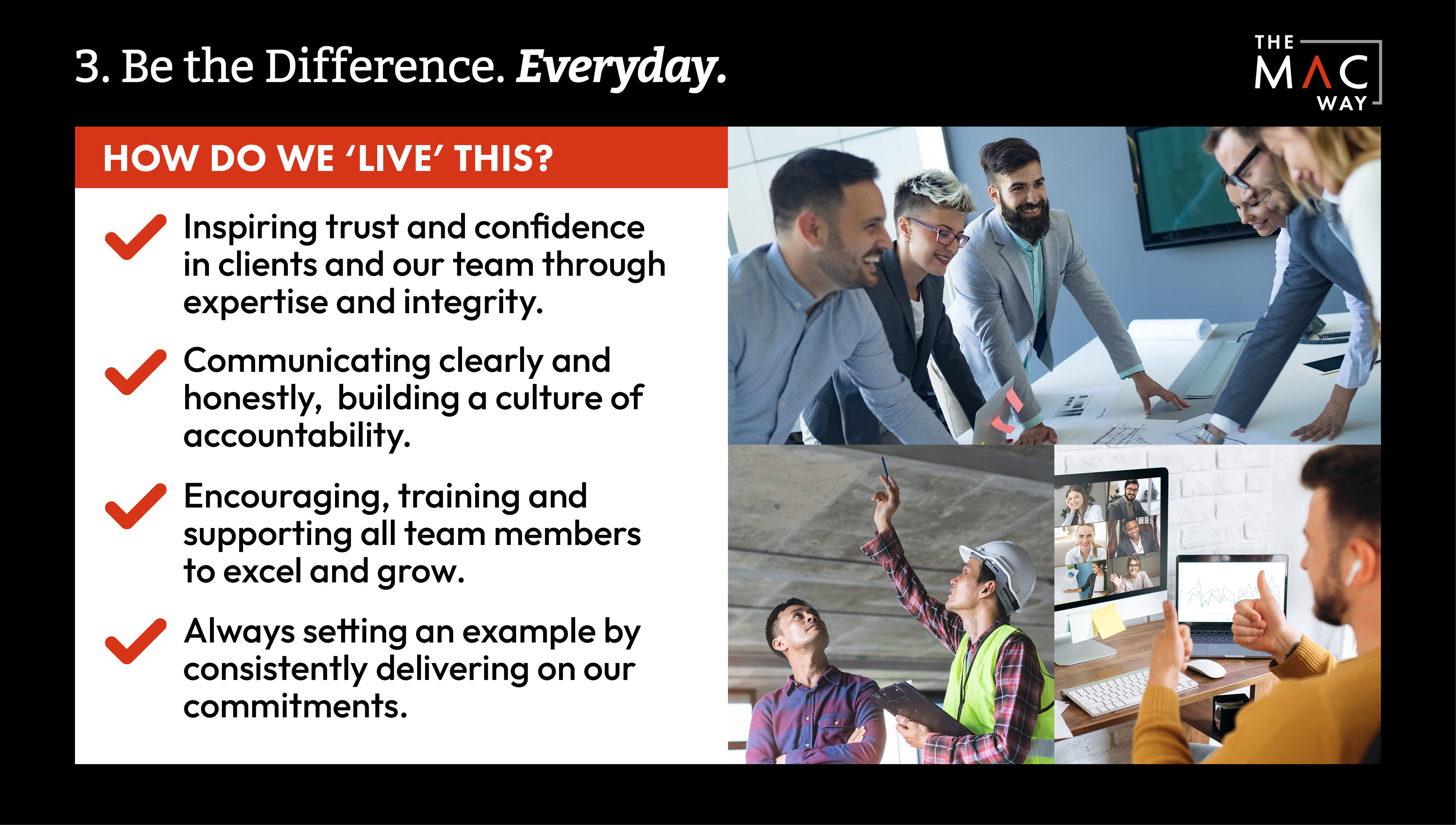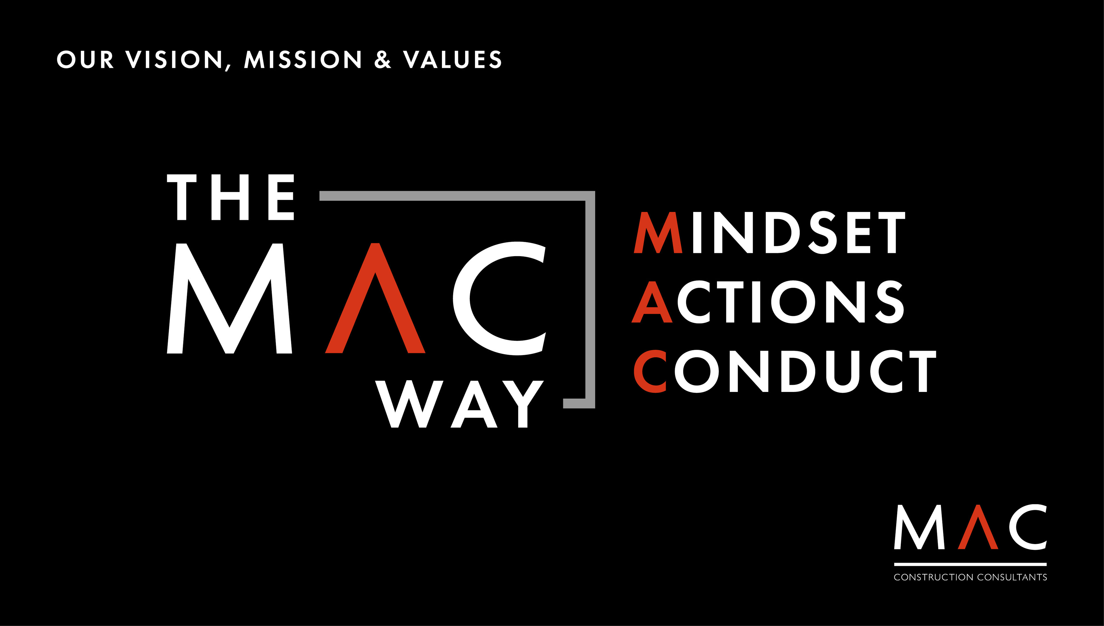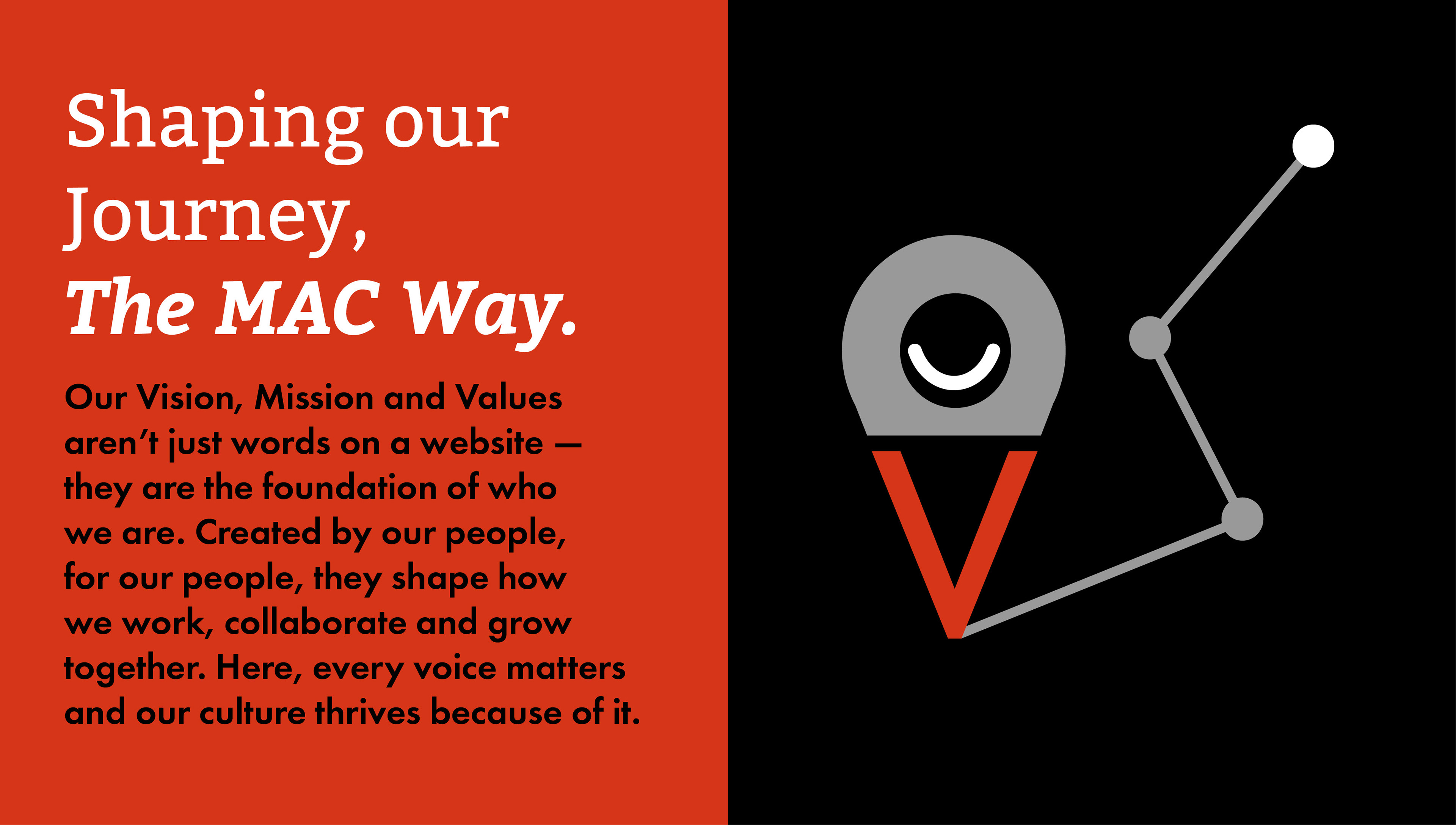 We created an umbrella sub brand 'The MAC Way' was created and a brand book was developed articulating these values, the positive outcomes and examples of how these values can be lived. This has also been a useful tool during the onboarding of new staff.
