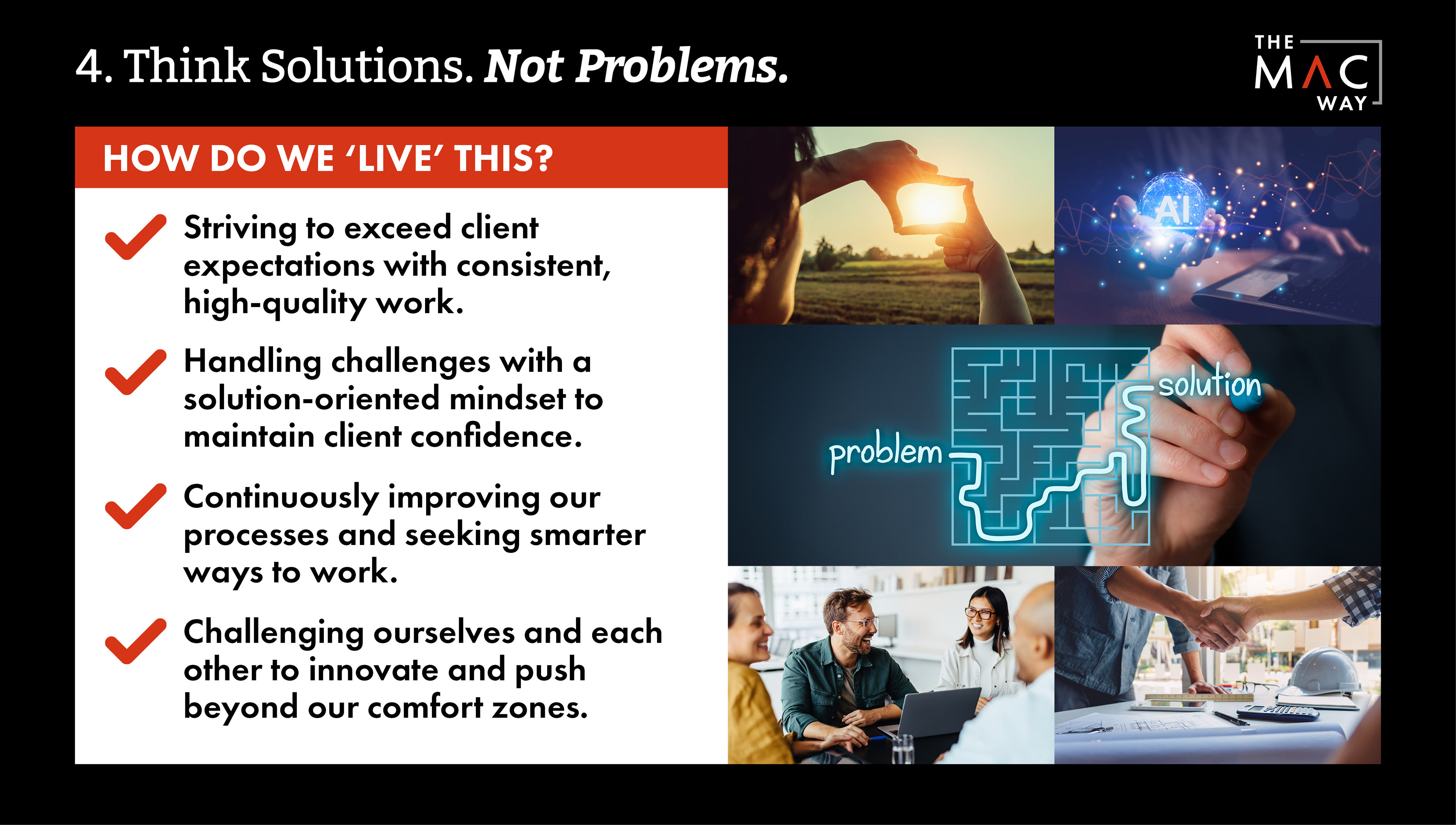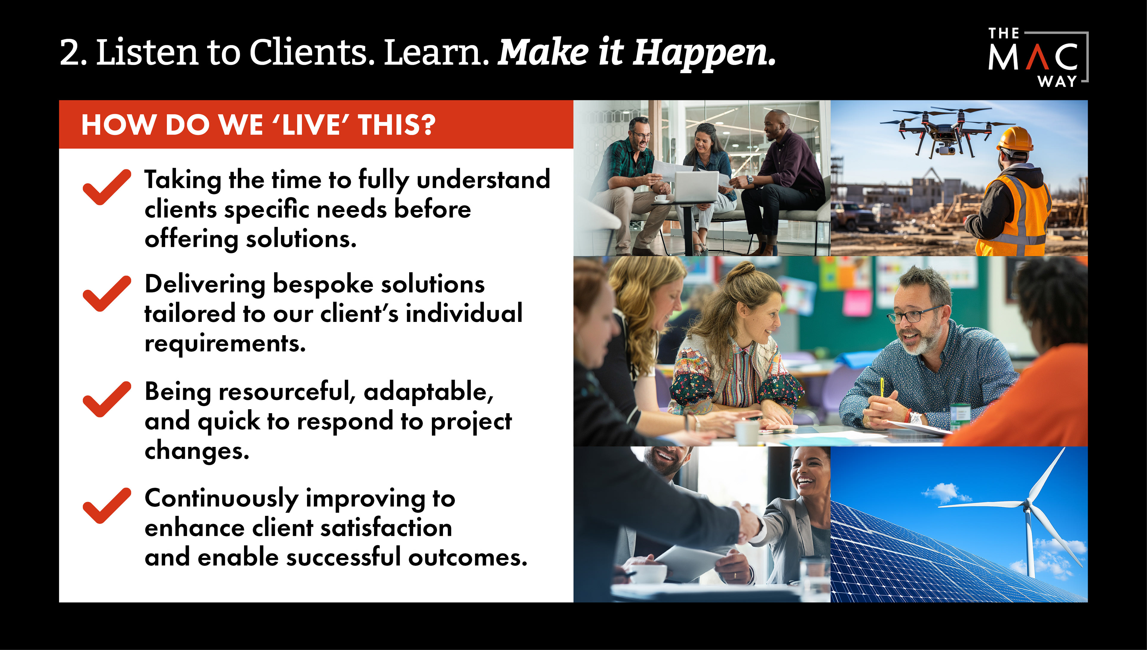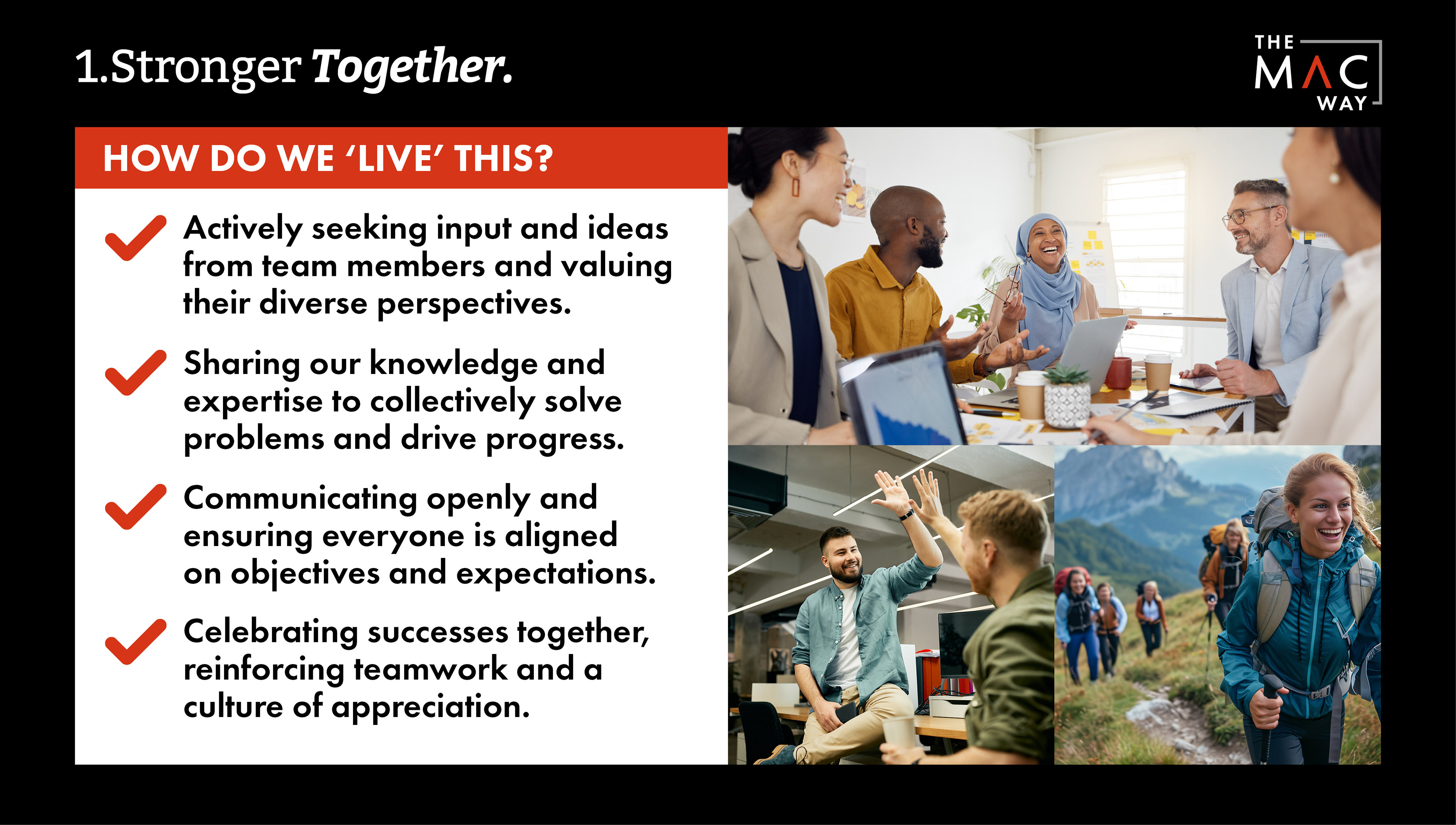 We created an umbrella sub brand 'The MAC Way' was created and a brand book was developed articulating these values, the positive outcomes and examples of how these values can be lived. This has also been a useful tool during the onboarding of new staff.